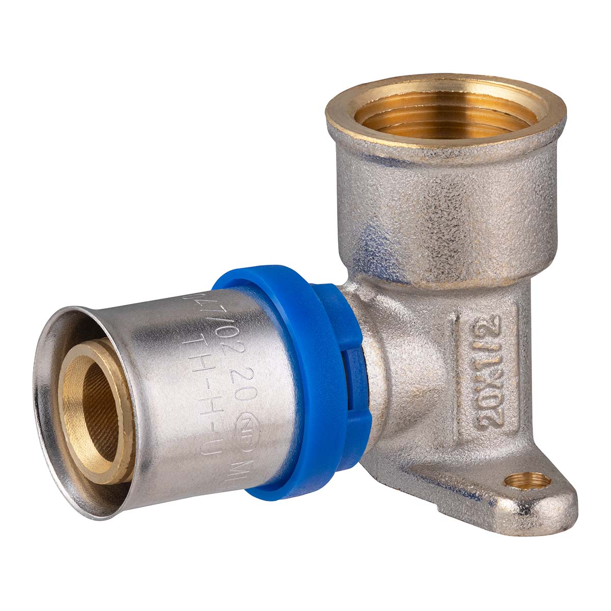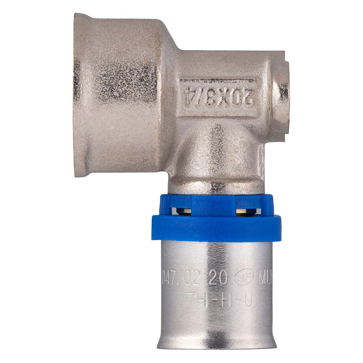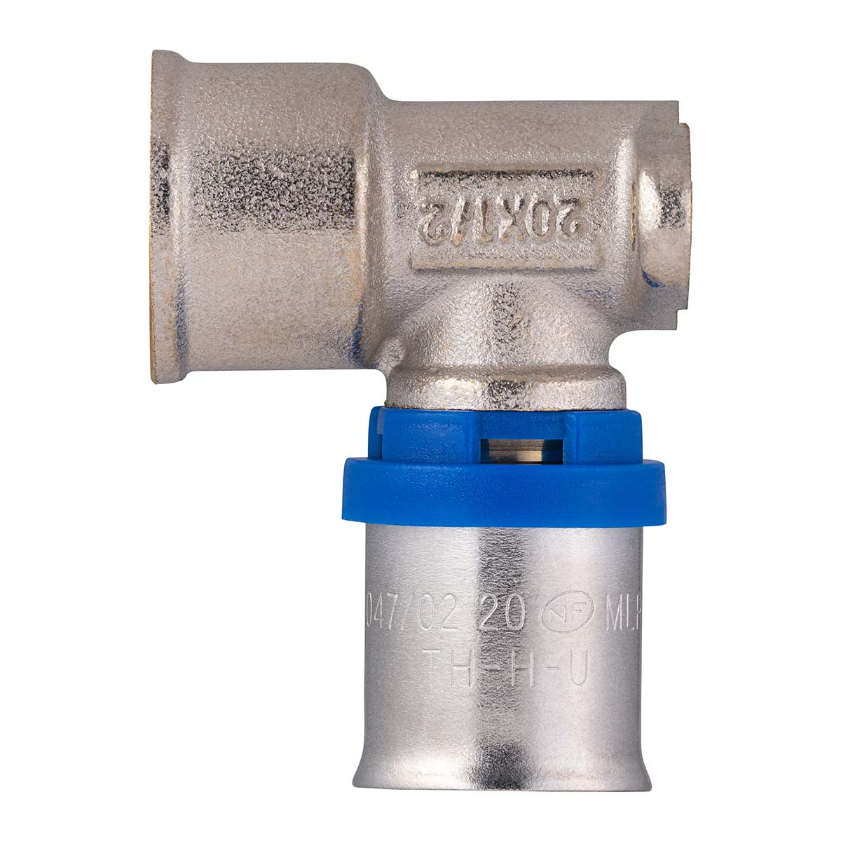Raccord pour tube multicouche, les raccords à sertir Noyon Thiebault sont certifiés multi-profils, à sertir avec une sertisseuse ou une pince à sertir manuelle avec des inserts TH | H | U , la bague bleue en HDPE permet de visualiser la bonne position du raccord sur le tube avant le sertissage