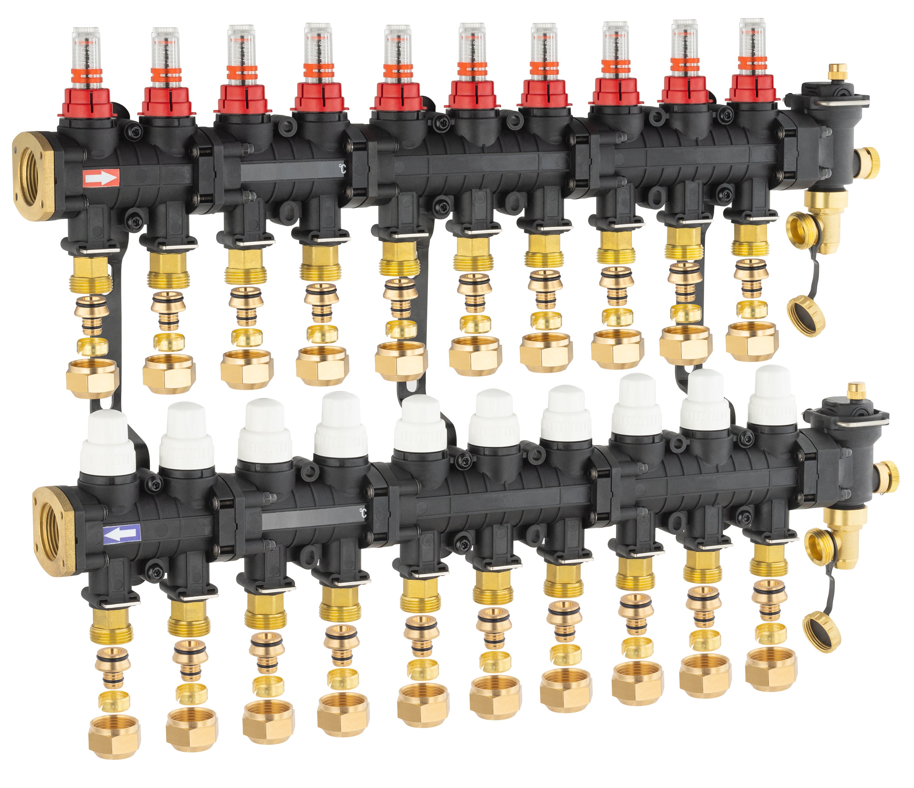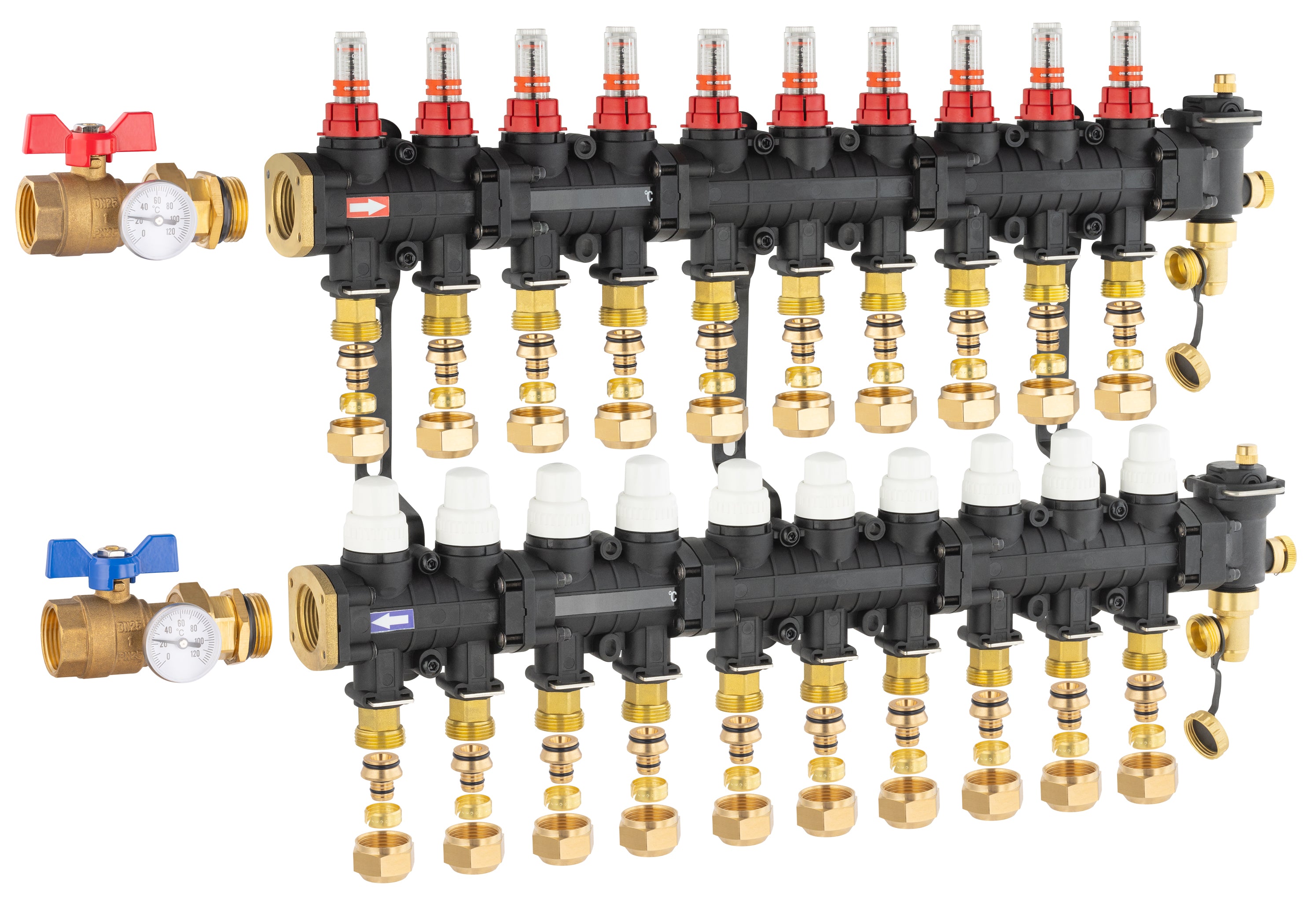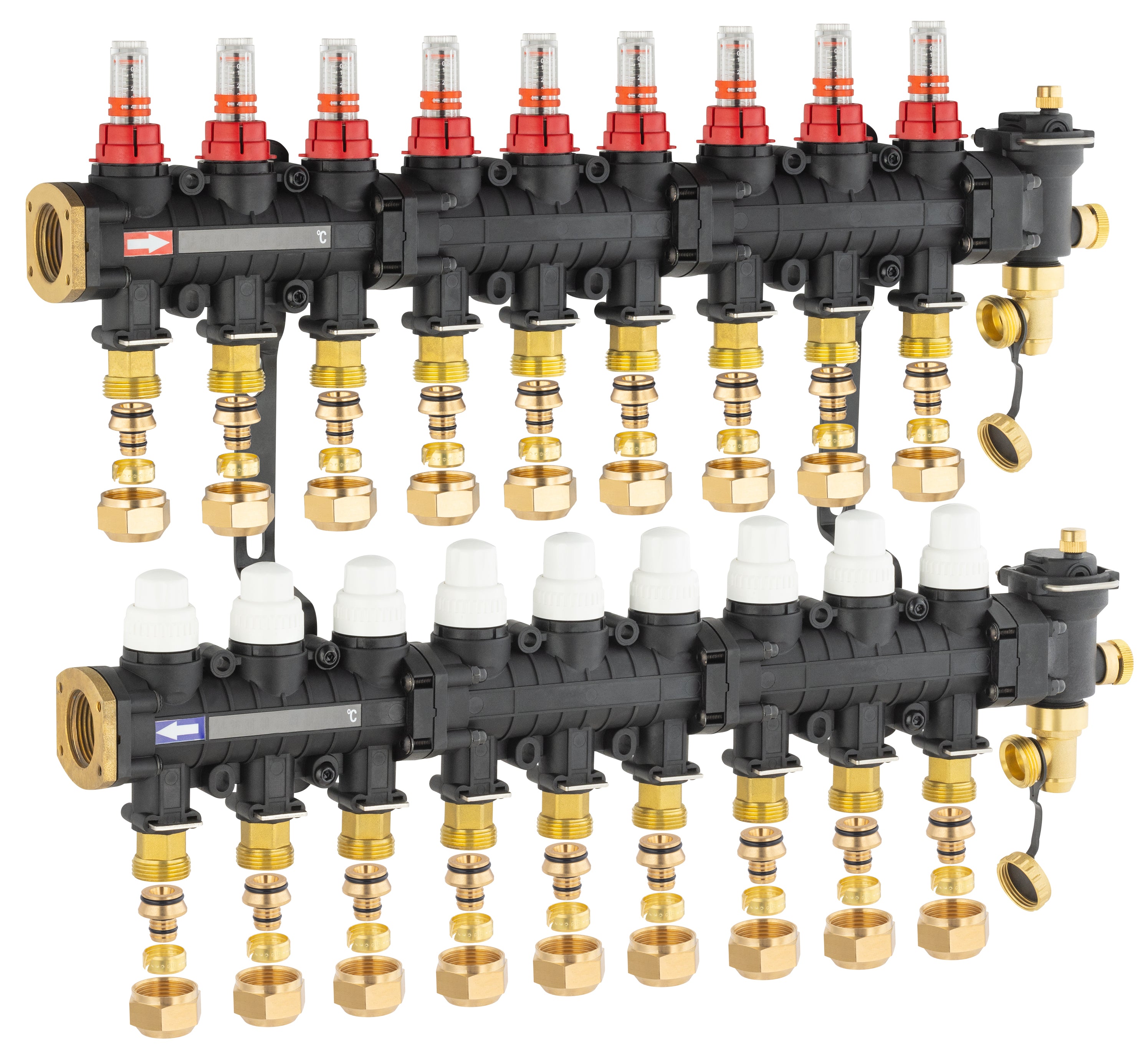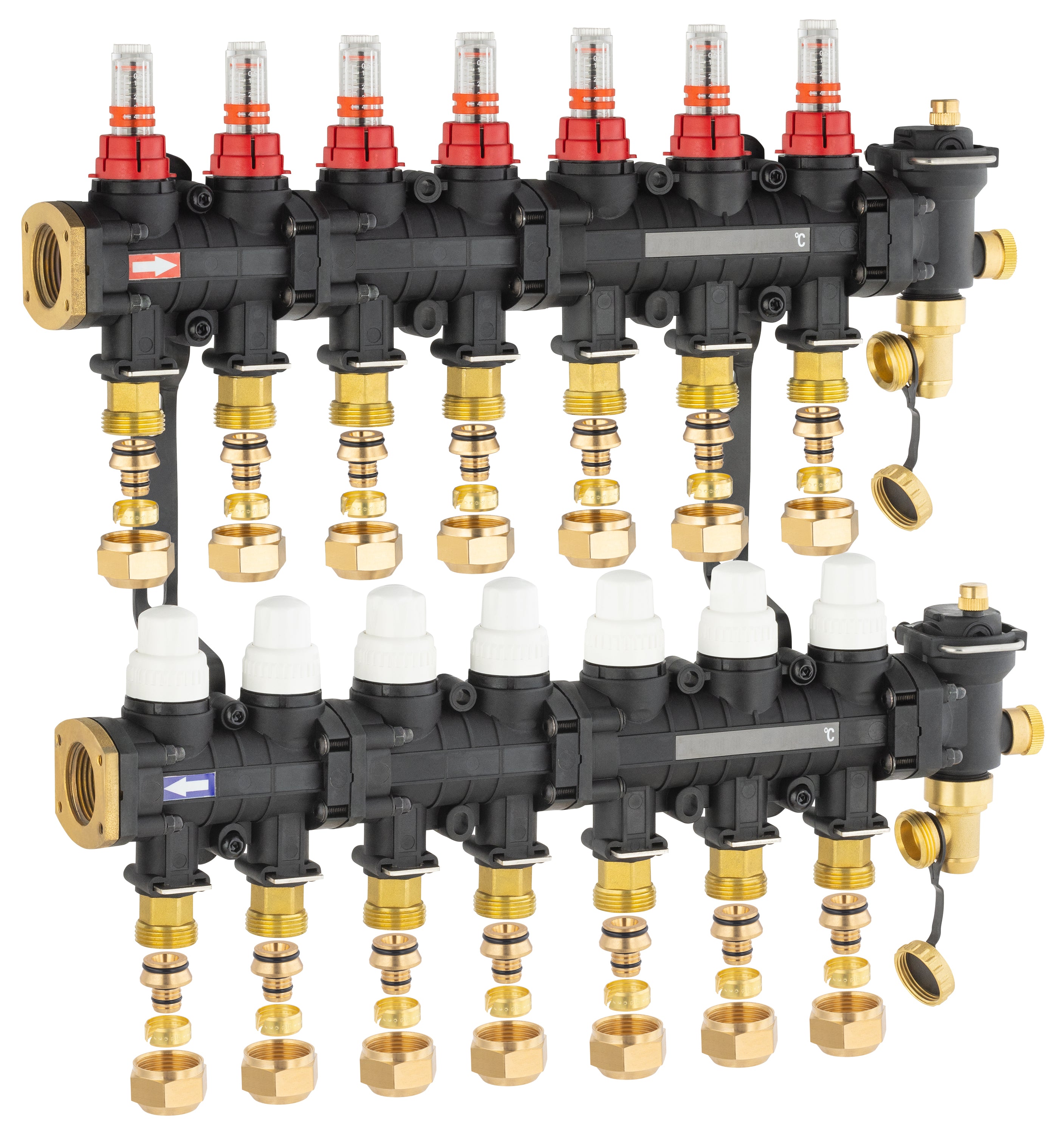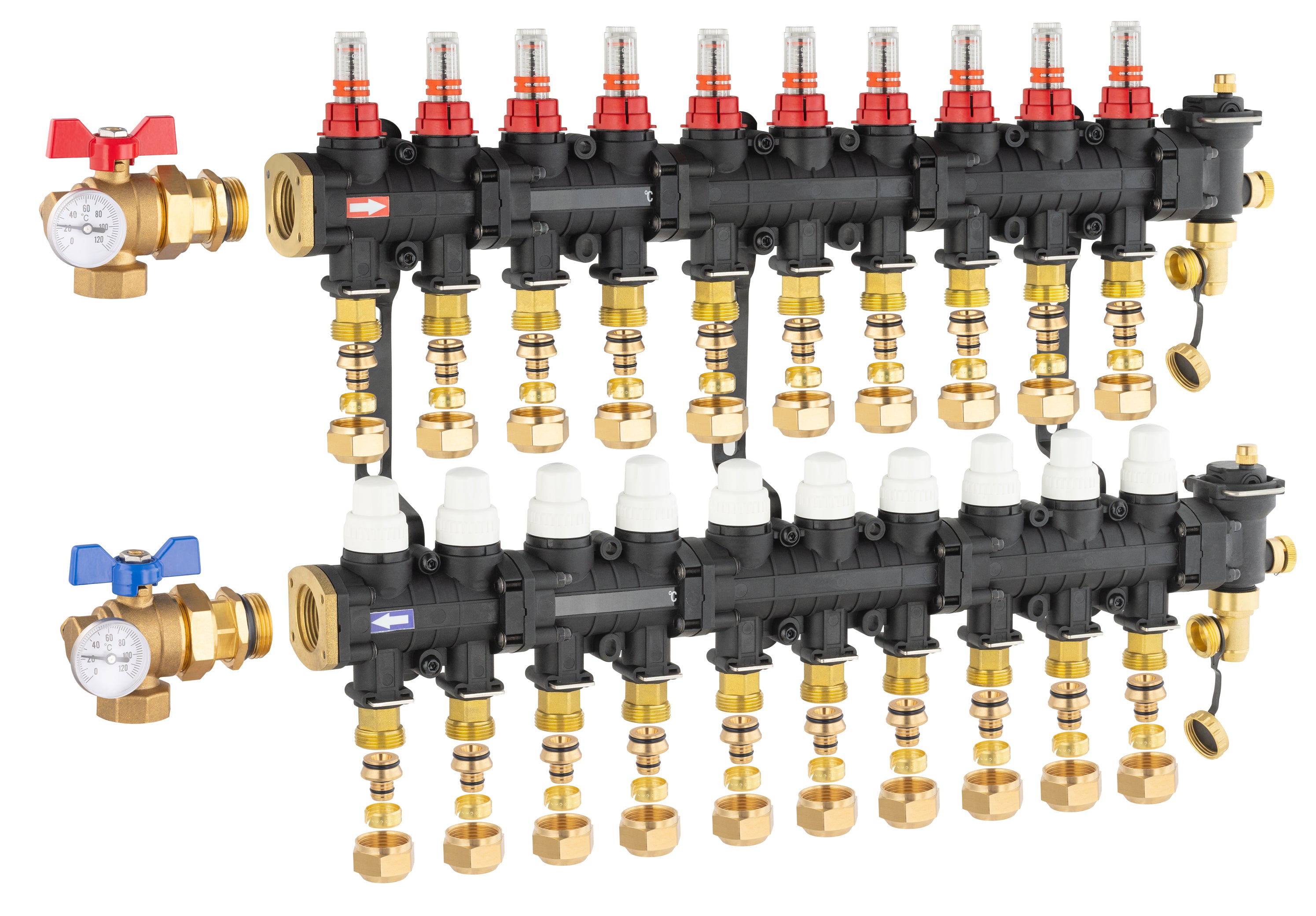 Chaque départ du collecteur est équipé d'un débitmètre, permettant ainsi l'équilibrage des boucles par une simple rotation des débitmètres. Des bagues de marquage du débit sont également incluses pour faciliter le réglage et la gestion du débit sur chaque boucle