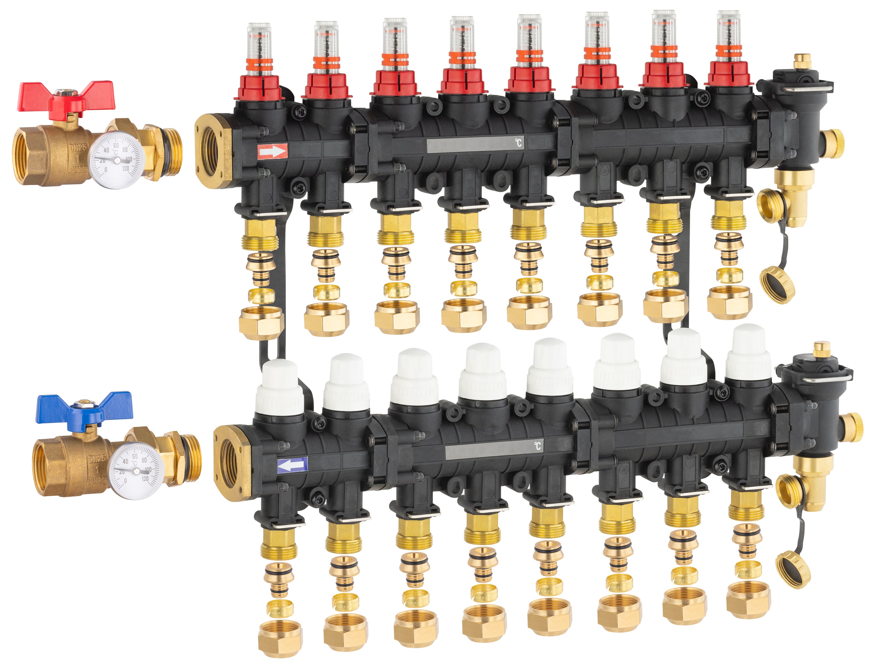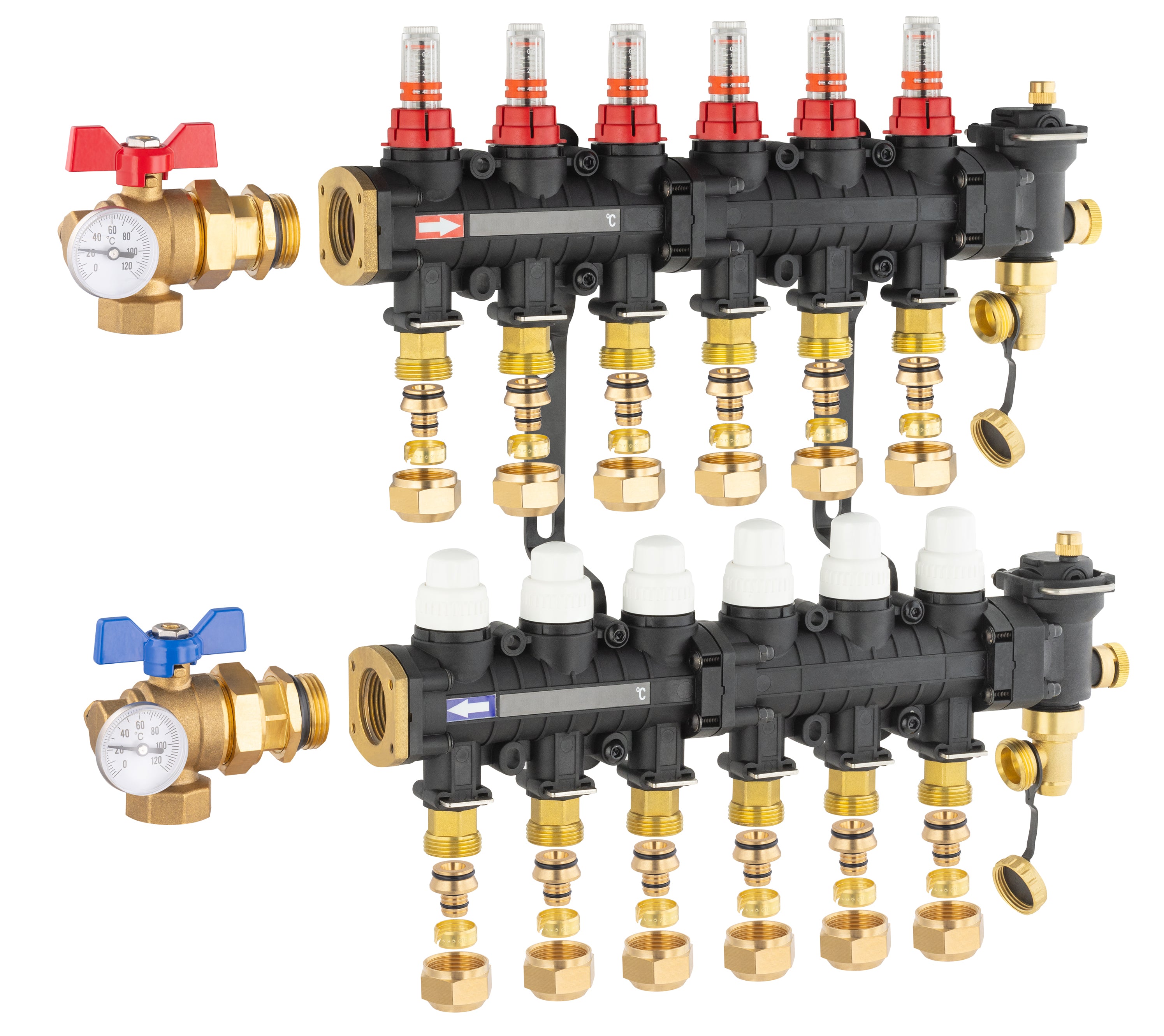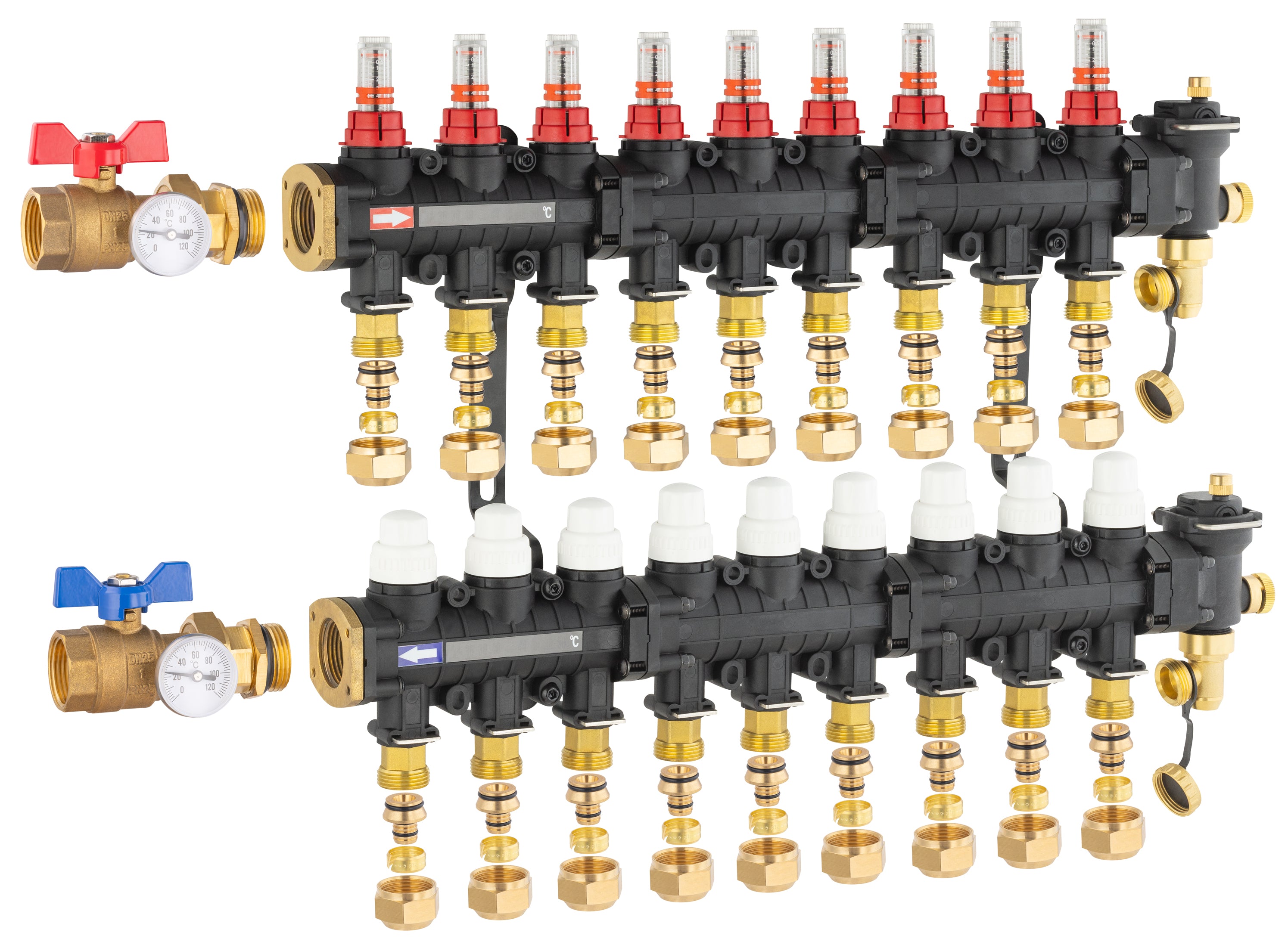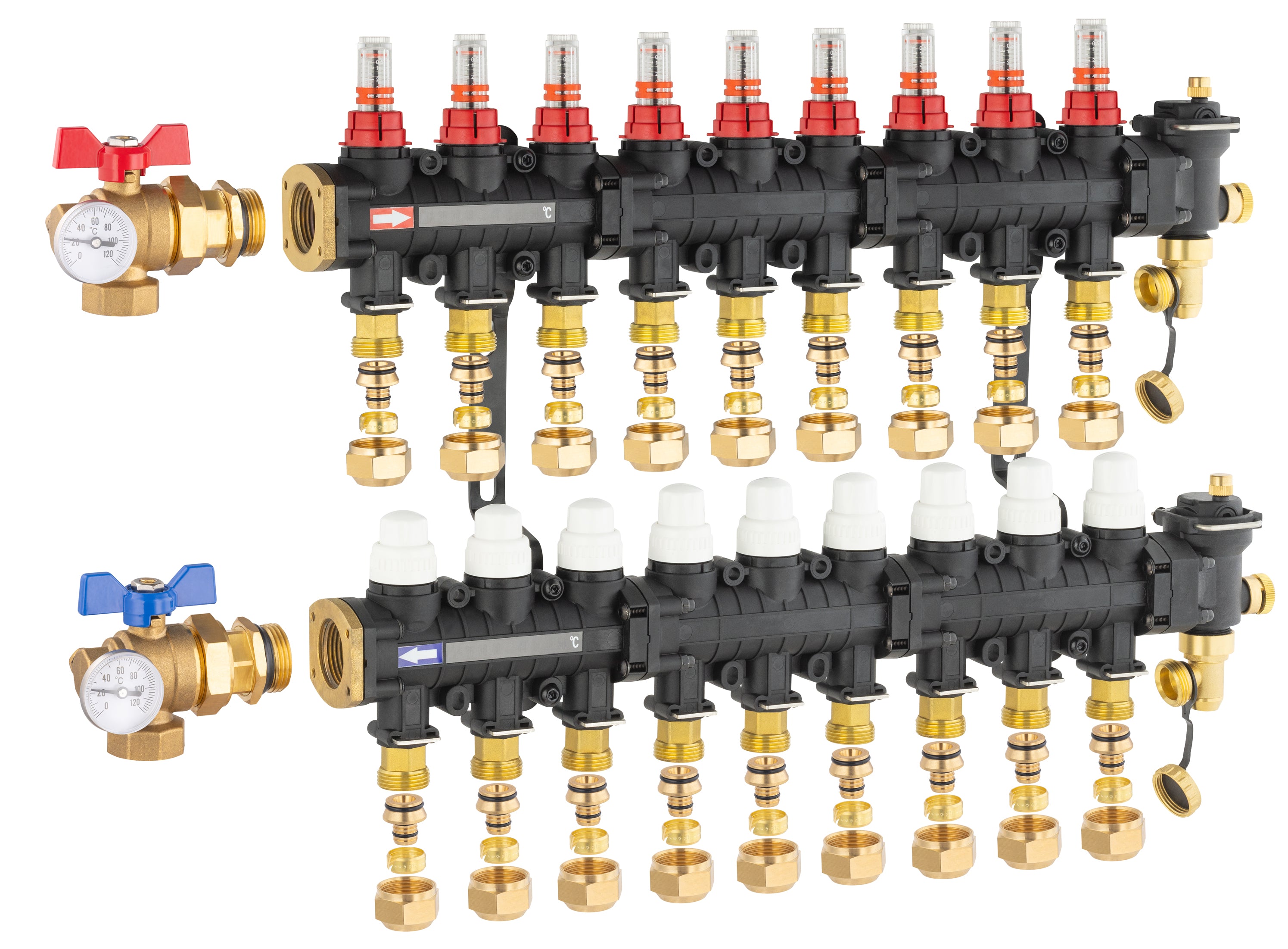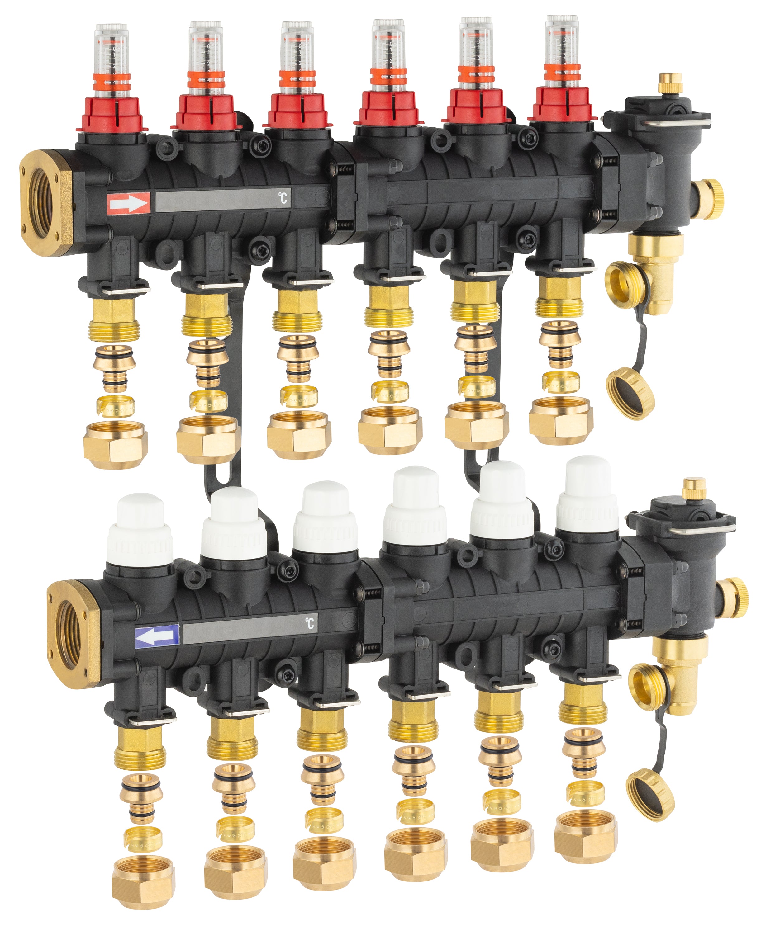 Chaque départ du collecteur est équipé d'un débitmètre, permettant ainsi l'équilibrage des boucles par une simple rotation des débitmètres. Des bagues de marquage du débit sont également incluses pour faciliter le réglage et la gestion du débit sur chaque boucle