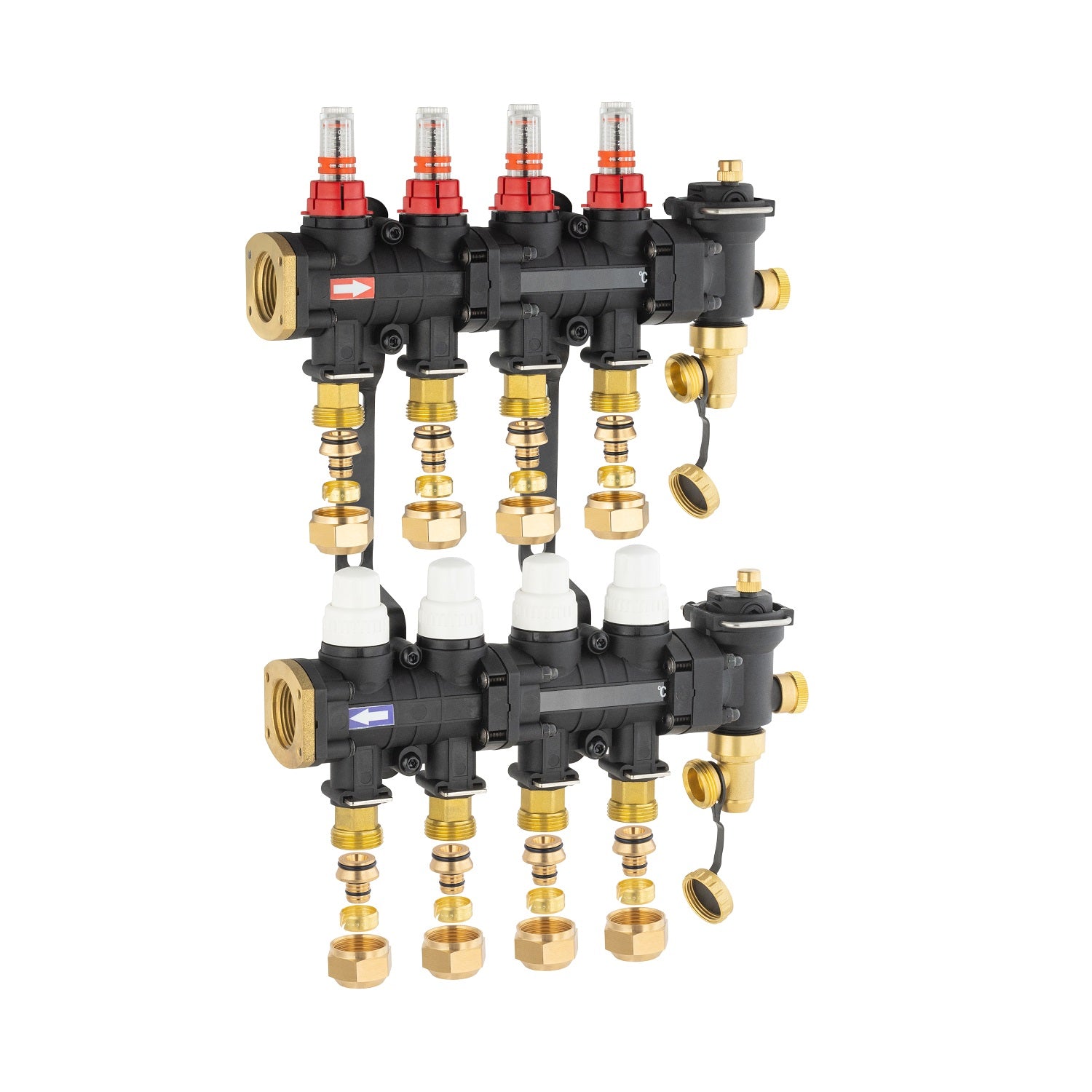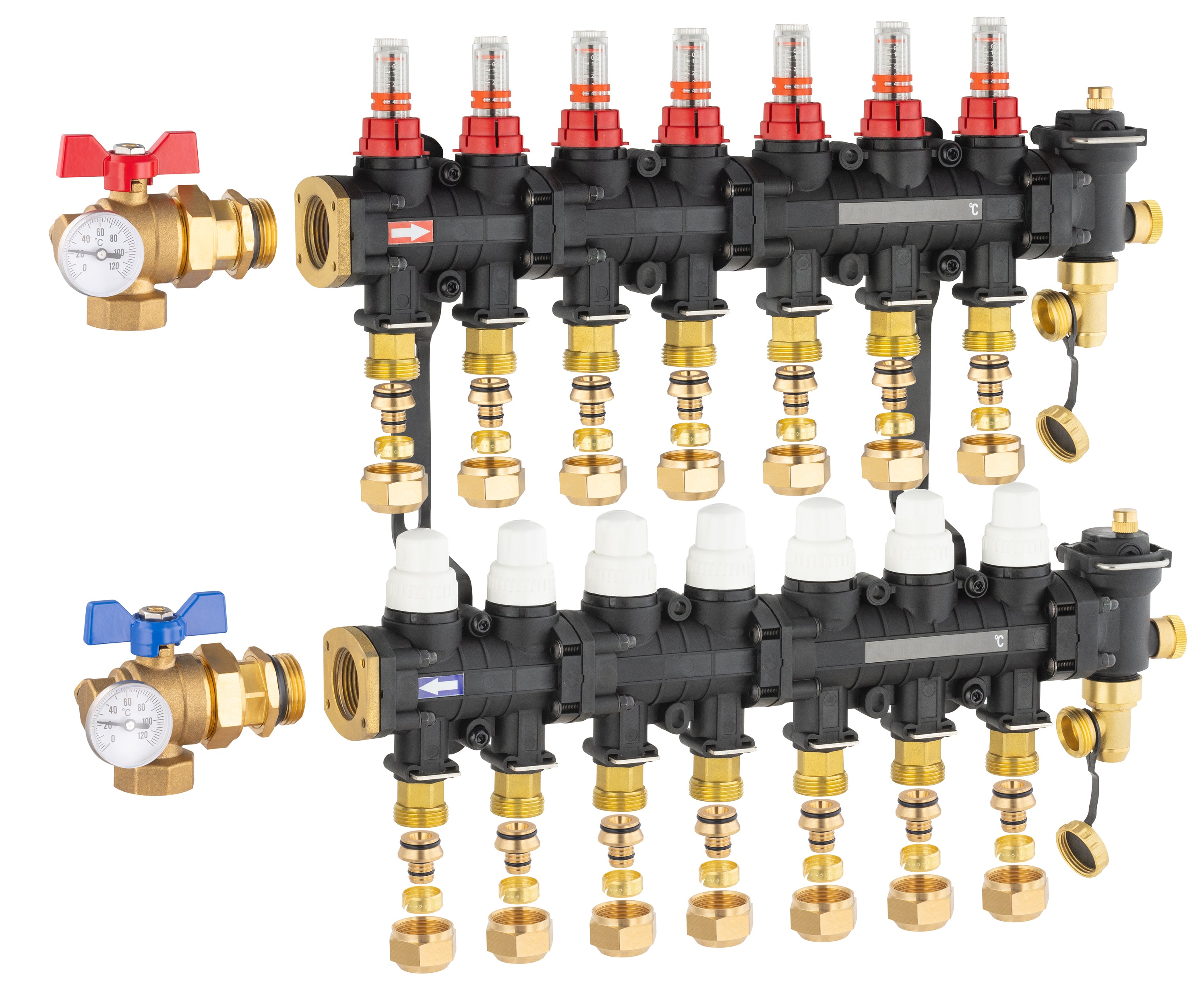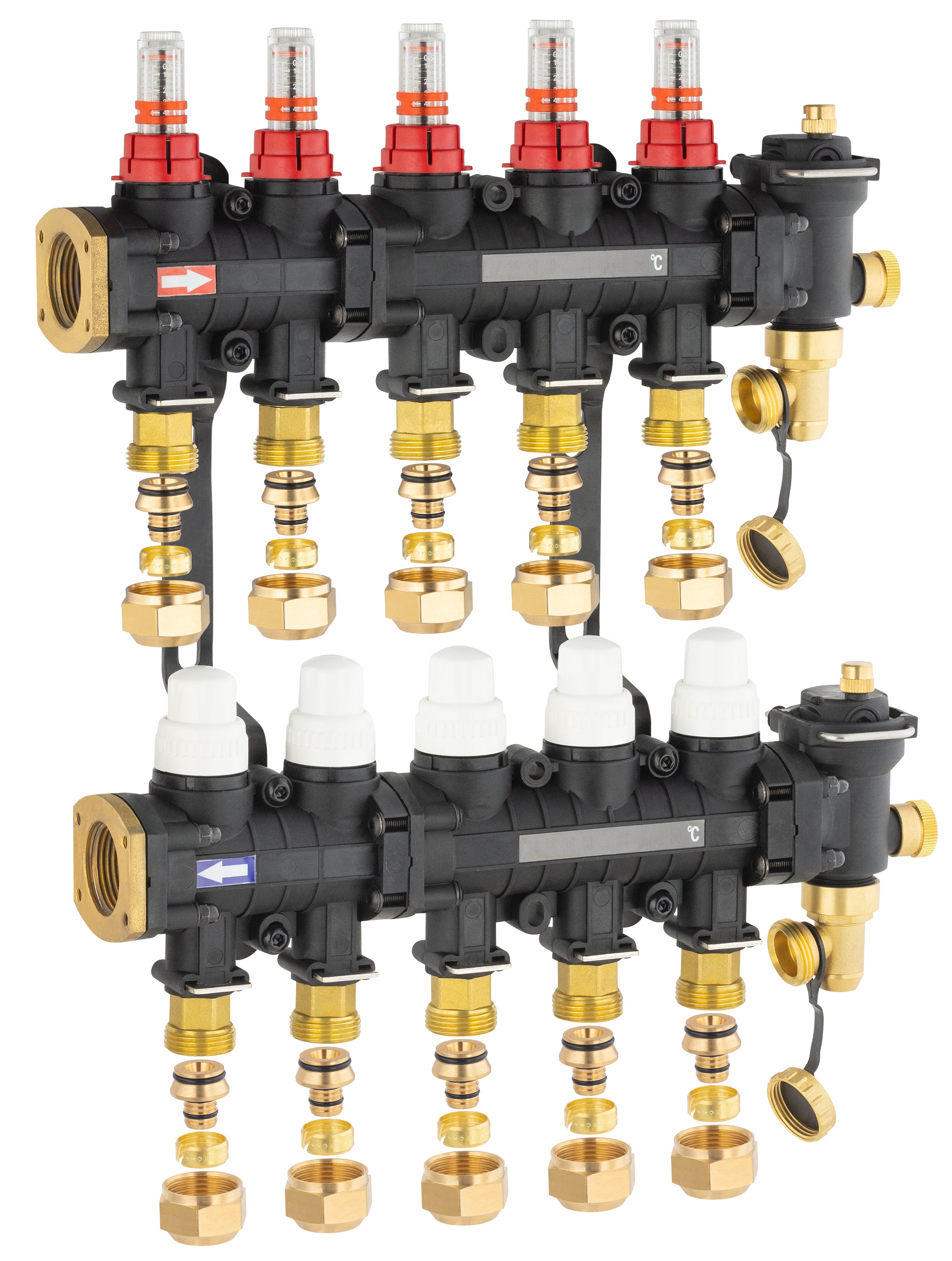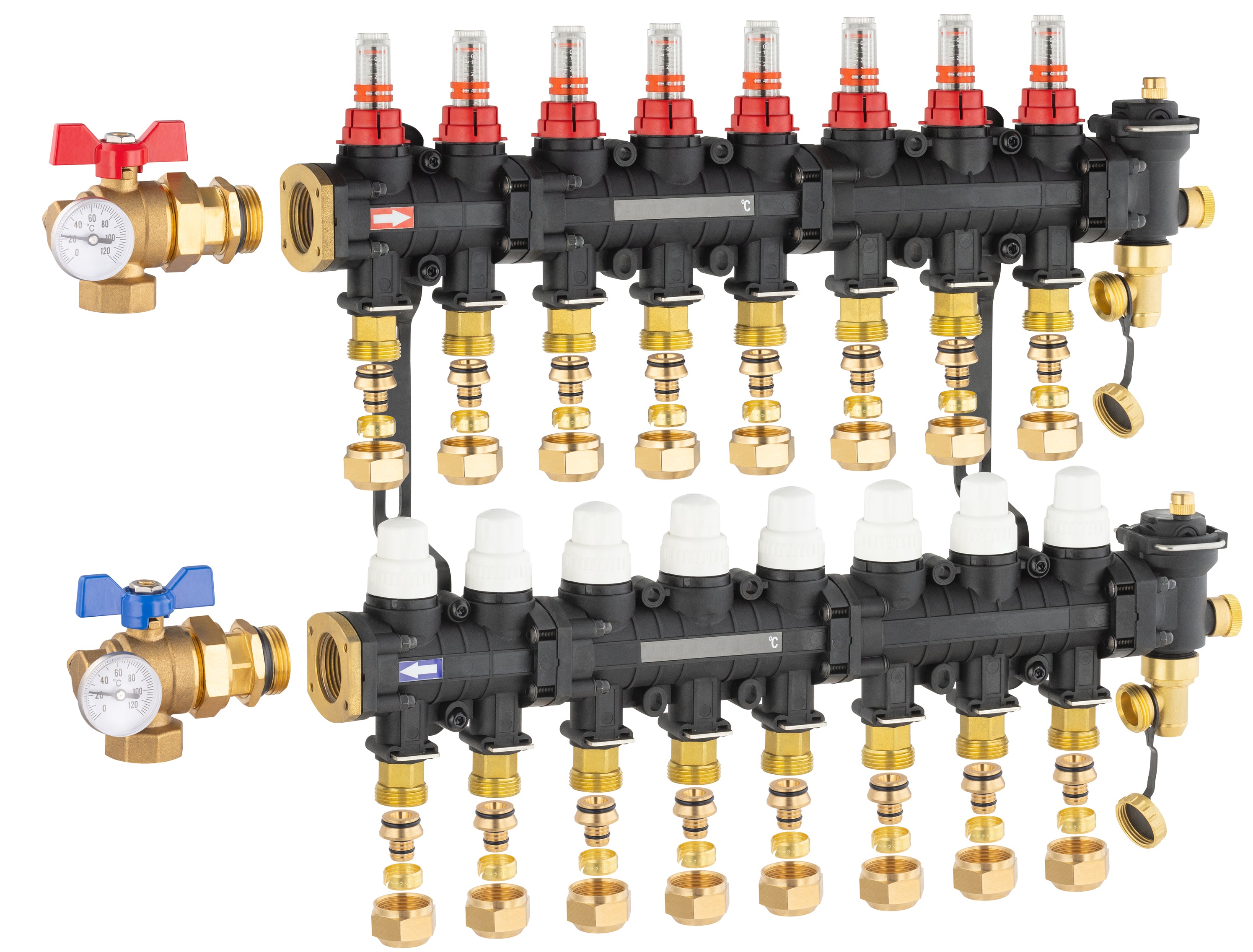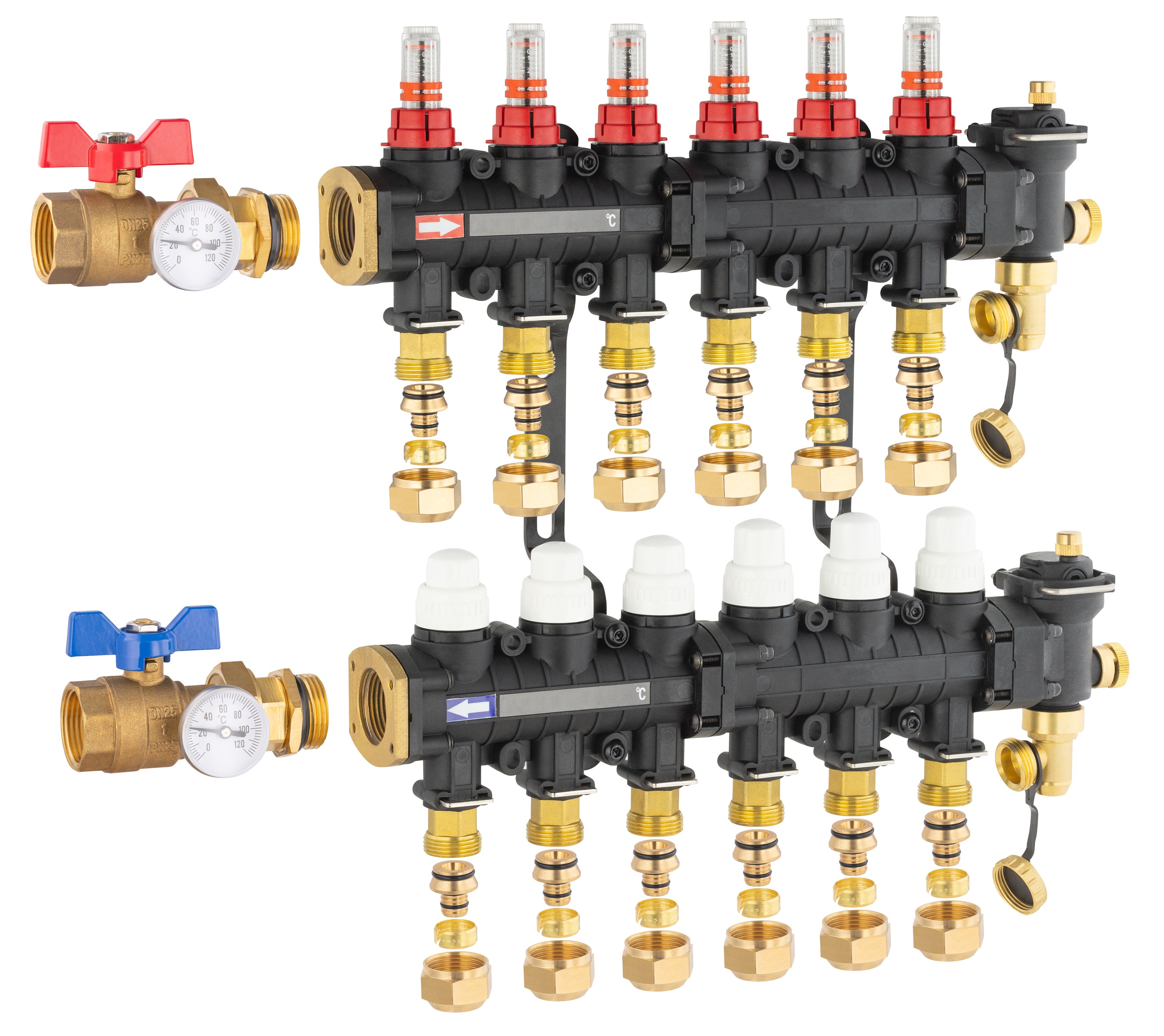 Chaque départ du collecteur est équipé d'un débitmètre, permettant ainsi l'équilibrage des boucles par une simple rotation des débitmètres. Des bagues de marquage du débit sont également incluses pour faciliter le réglage et la gestion du débit sur chaque boucle
