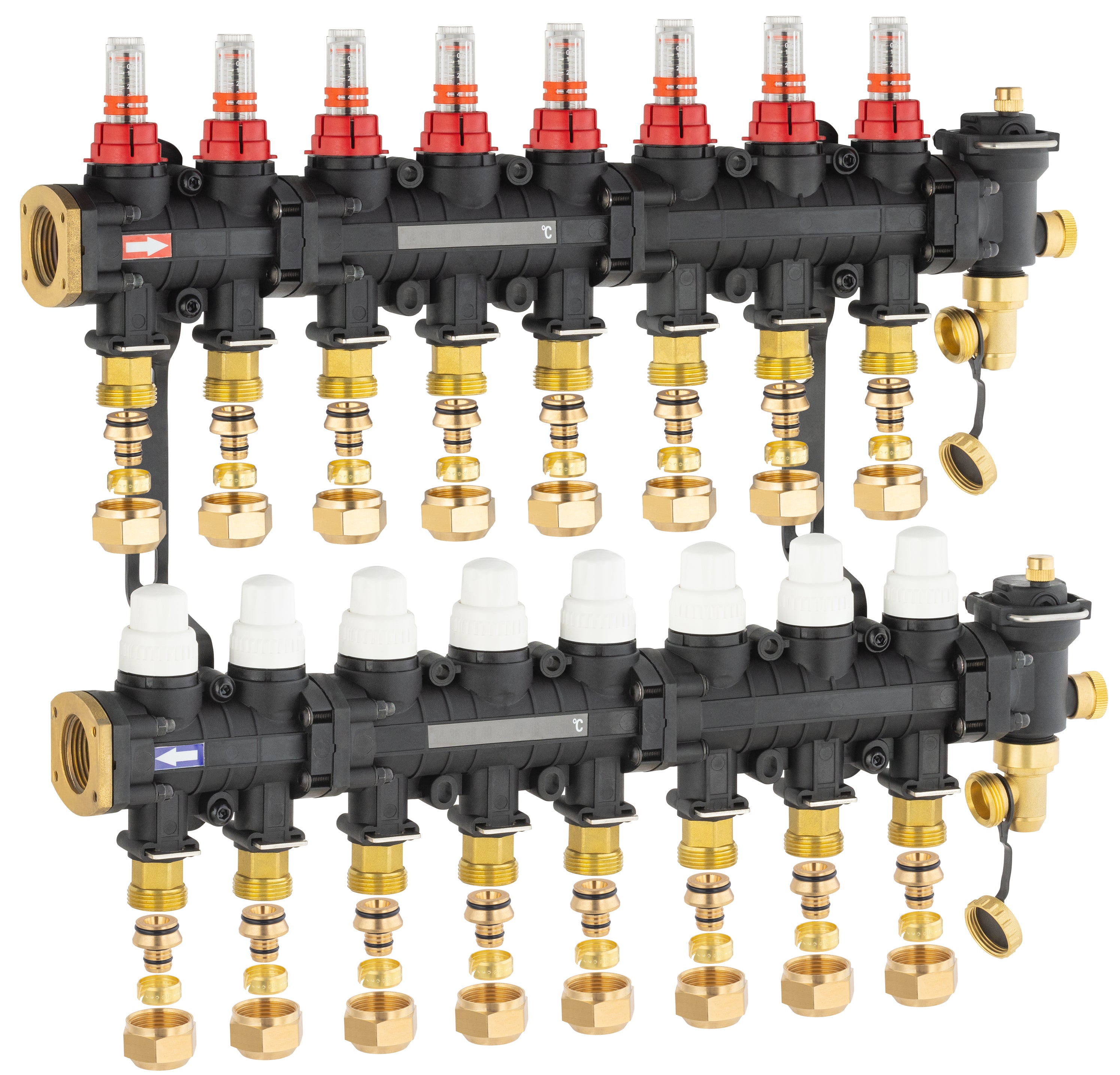 Nos collecteurs sont polyvalents et compatibles avec des vannes thermostatiques L'utilisation du collecteur est intuitive, car le bouchon blanc peut être utilisé comme volant manuel si le collecteur n'est pas équipé de têtes thermostatiques